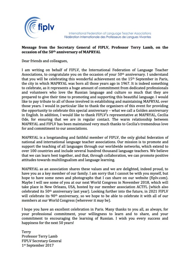 International Association of Teachers of Russian Language and Literature (MAPRYAL) recently celebrated its 50th anniversary in Paris. Here is a report from the association in Russian. Here is a report in English.