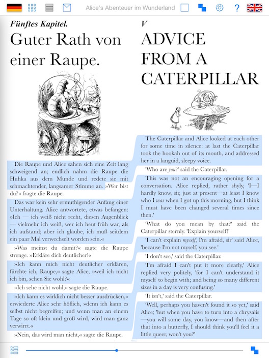 The app displays two translations of a book or text, and keeps the translations in sync as you read. You can read a book in your new language and have a parallel copy in your mother tongue handy for reference. Tap a paragraph to show the translation, or display the two versions in full beside each other.